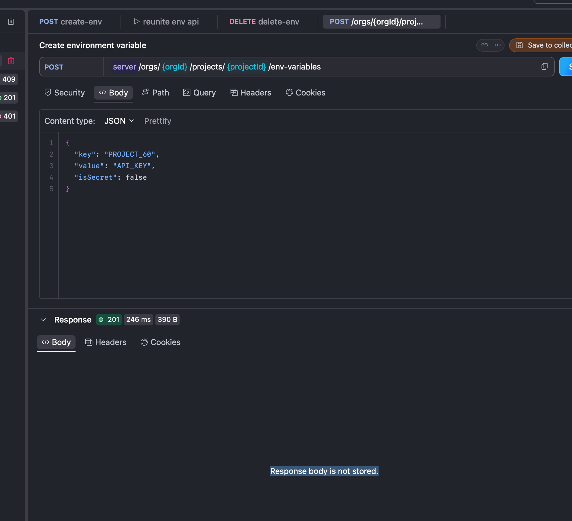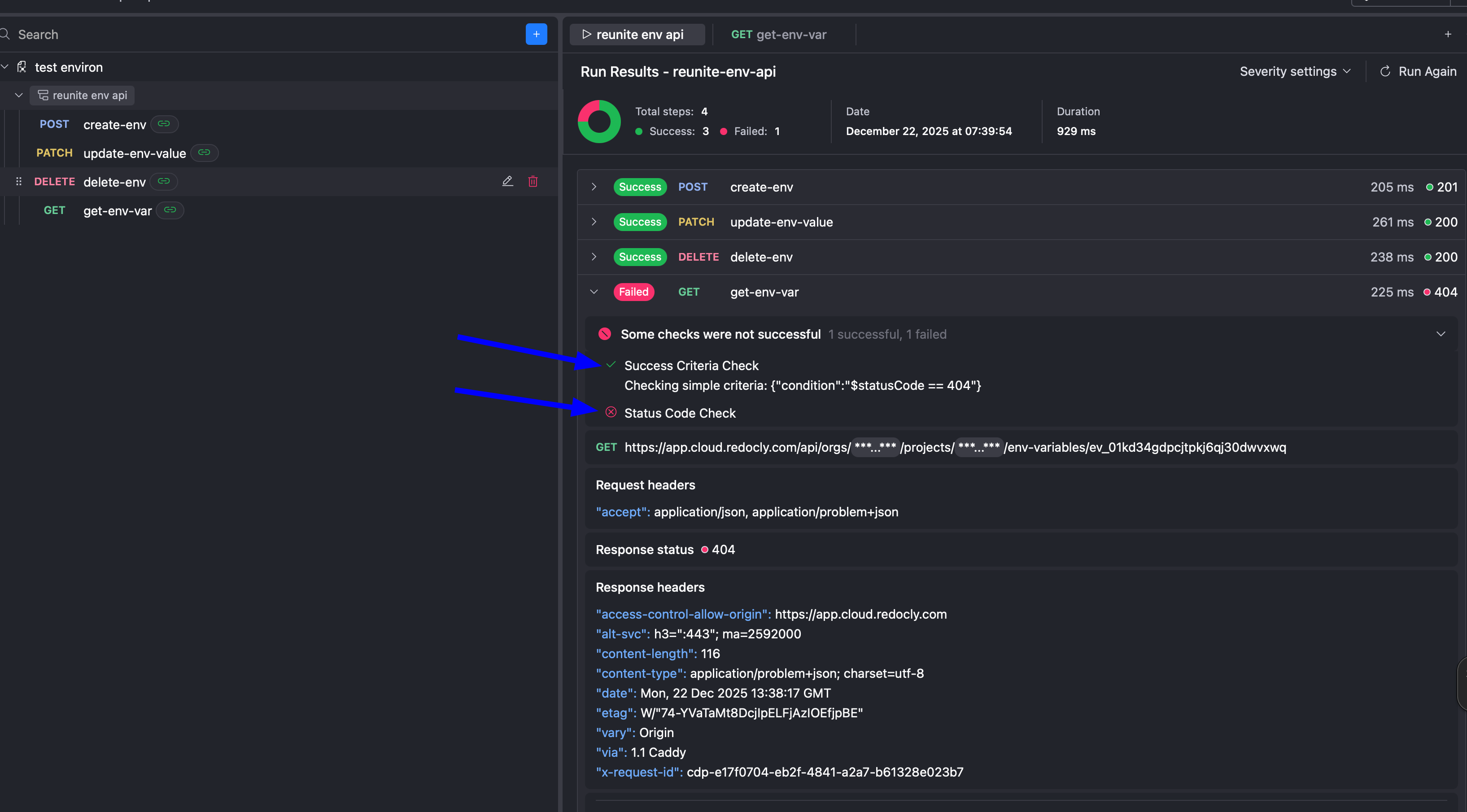 After deleting the environment variable, we check it is deleted by trying to get it again. We are expecting a 404.